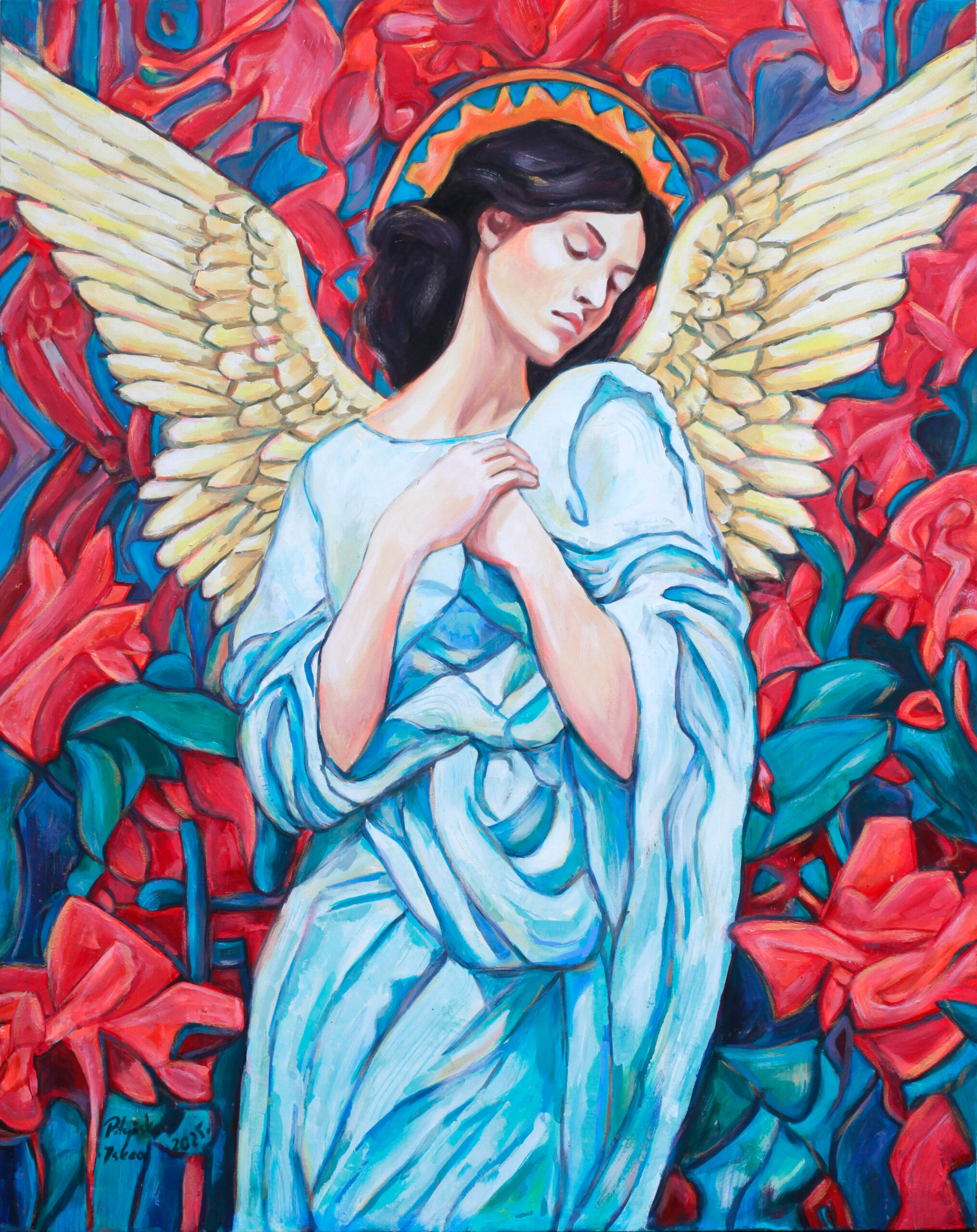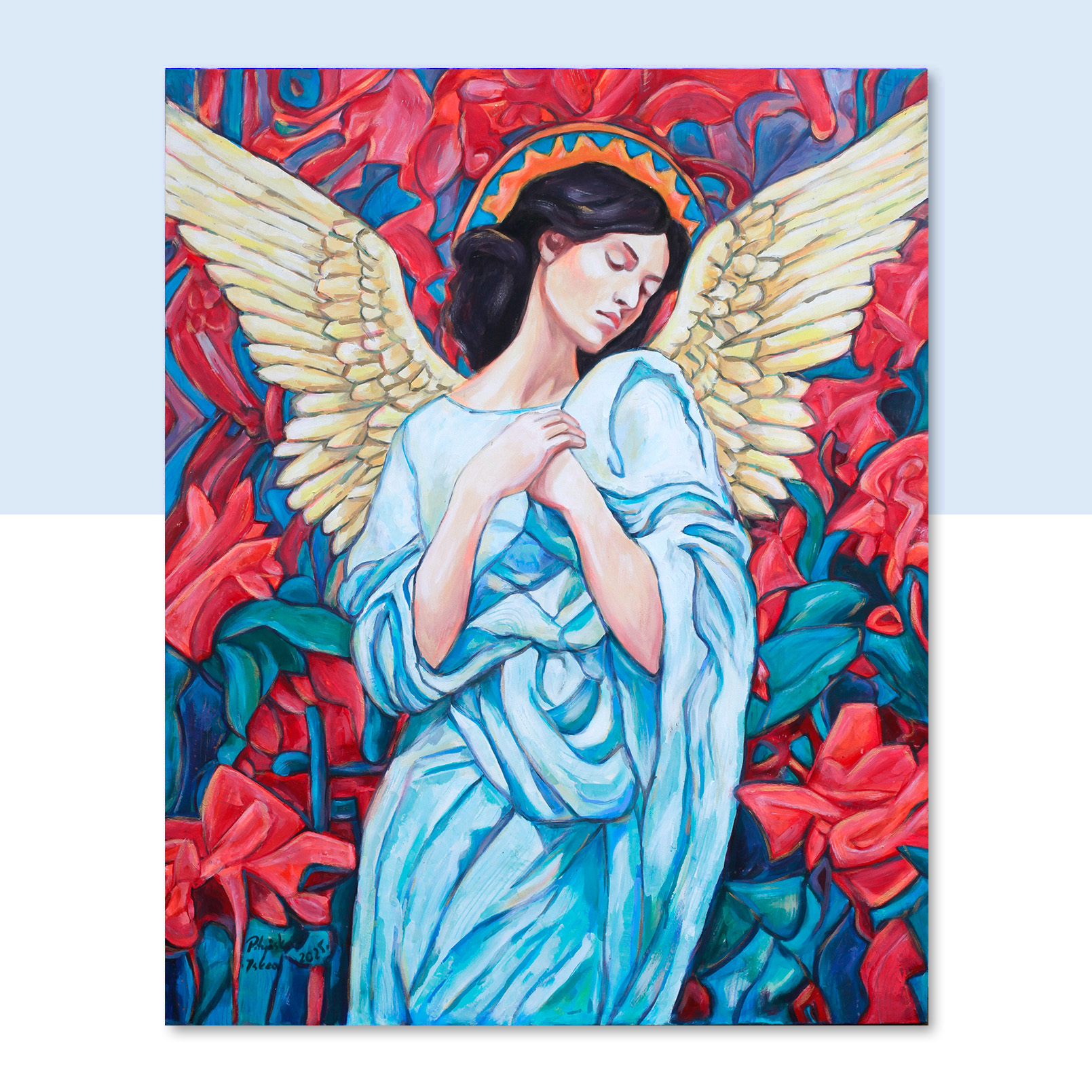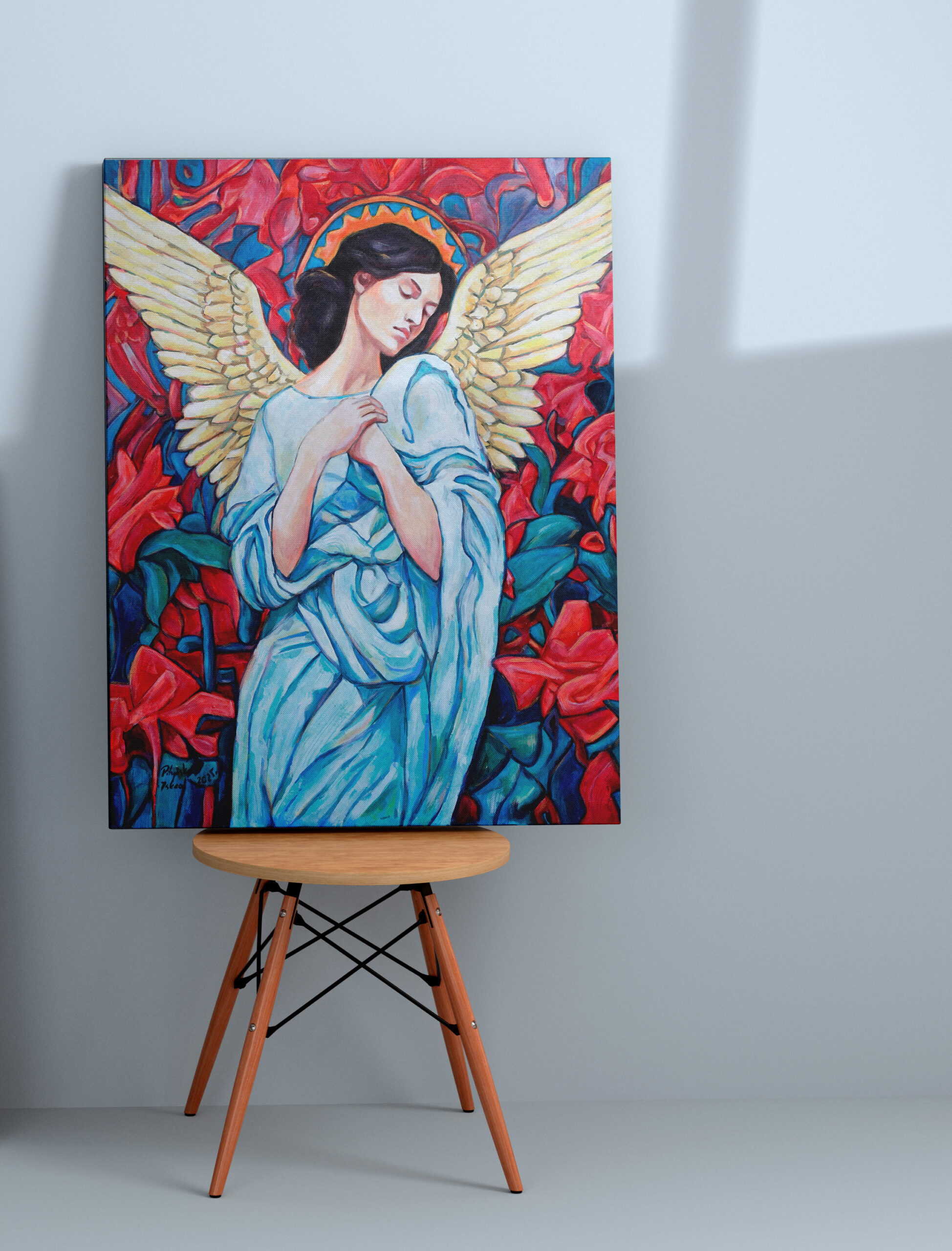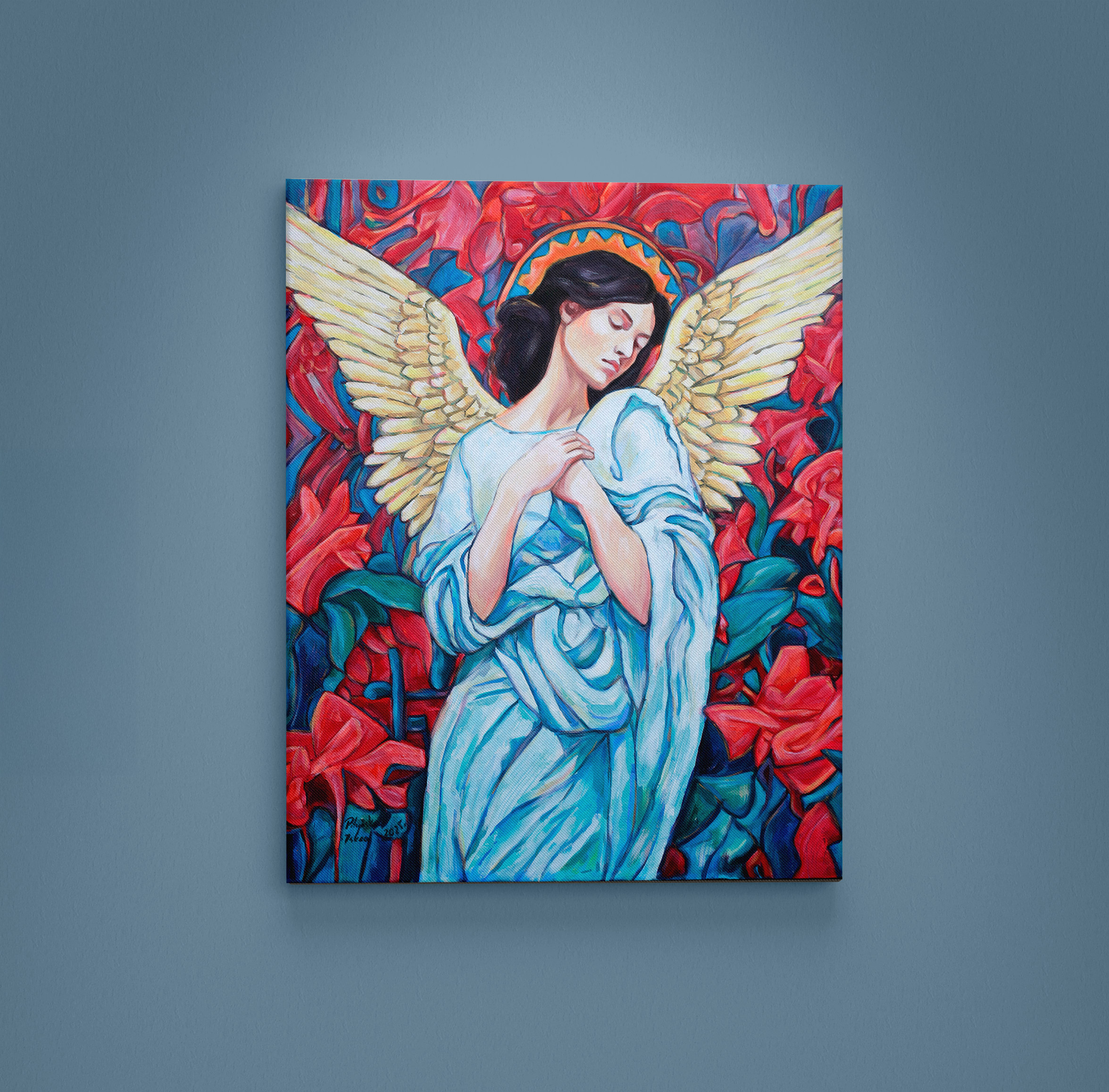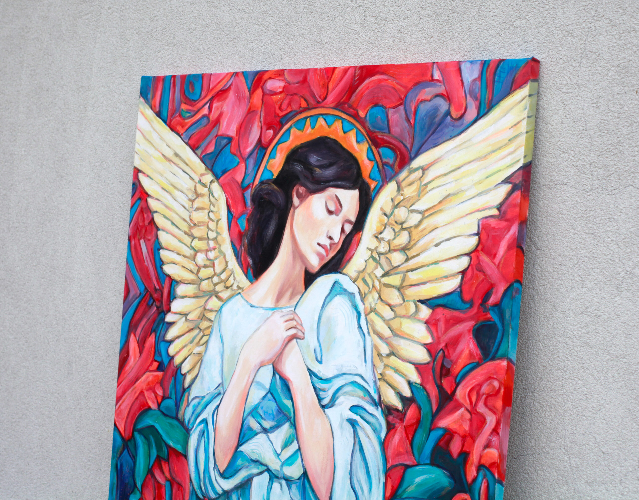 Anioł w pczerwieniach. Ociepla wnętrze intensywnymi kolorami.
